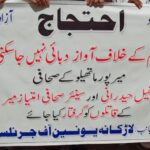 لاڙڪاڻي ۾ پاڪستان فيڊرل يونين آف جرنلسٽس جي سڏ تي لاڙڪاڻو يونين آف جرنلسٽس طرفان مرڪزي سڏ تي ڪراچي جي سينيئر صحافي اينڪرپرسن امتياز مير ۽ ميرپورماٿيلو جي صحافي طفيل حيدراڻي جي قاتلن جي گرفتاريءَ لاءِ يونين جي صدر طارق محمود درانيءَ جي اڳواڻيءَ ۾ پريس ڪلب آڏو احتجاجي مظاهرو ڪيو ويو