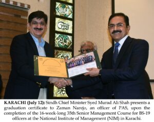 ڪراچي (12 جولاءِ): سنڌ جي وڏي وزير سيد مراد علي شاهه ان ڳالهه تي زور ڏنو آهي ته عوام جي پختي اعتماد کانسواءِ جمهوريت جو اڳتي وڌڻ ڏکيو آهي تنهنڪري اهو انتهائي اهم آهي ته ماڻهن جي اعتماد کي بحال ڪرڻ لاءِ سڌو سنئون موثر خدمت ڪرڻ ۽ سٺي حڪمراني فراهم ڪئي وڃي، جيڪڏهن عوام سرڪاري خدمتگارن جو ساٿ نٿي ڏئي ته پوءِ عوامي ڊپ کي پنهنجي يقين ۽ ذاتي عزم سان کين خدمت ڪرڻ گهرجي. هن اها ڳالهه اڄ نيشنل انسٽيٽيوٽ آف مئنيجمينٽ (اين آءِ ايم) ڪراچي ۾ 35هين سينيئر مئنيجمينٽ ڪورس (گريڊ 19 آفيسرن) جي شرڪت ڪندڙن جي گريجوئيشن تقريب کي خطاب ڪندي ڪئي جن پنهنجو 16 هفتن جو ڊگهو ڪورس اڄ مڪمل ڪيو. تقريب ۾ ڊي جي NIM ڊاڪٽر لبنيٰ ايوب، چيف انسٽرڪٽر خليق شيخ، چيف انسٽرڪٽر مڊ ڪيريئر مئنيجمينٽ ڪورس (MCMC) ۽ ٻين شرڪت ڪئي. وڏي وزير ٻن عورتن سميت سمورن 38 آفيسرن کي ڪورس مڪمل ڪرڻ تي مبارڪباد ڏني. وڏي وزير چيو ته عوامي خدمت کي پيشي طور تي چونڊڻ هڪ غير معمولي پيشي کان وڌيڪ ذاتي پسند ۽ رضاڪارانه عزم آهي. هڪ محنتي سرڪاري ملازم ڏينهن رات اڻٿڪ محنت ڪري عوام جي خدمت ڪري ٿو ۽ جديد عوامي پاليسيون جوڙي پاليسين تي اثرائتي نموني عملدرآمد کي يقيني بڻائي ٿو. وڏي وزير چيو ته موجوده ايس ايم سي گروپ ۾ وفاقي حڪومت جي مختلف ڪيڊرز ۽ گروپن جا آفيسر شامل آهن جيڪي پاڪستان ۽ سنڌ مان آيا آهن. هن وڌيڪ چيو ته اين آءِ ايم ڪراچي جي خدمتن کي ڏسندي سنڌ حڪومت اين آءِ ايم ڪراچي کي پنهنجو ادارو بڻائيندي ان سان لاڳاپن ۽ تعاون کي وڌيڪ مضبوط ڪندي ۽ وڌ کان وڌ شرڪت ڪندڙن جي پروفيشنل ضرورتن کي پورو ڪرڻ لاءِ هر ممڪن سهڪار ڪندي. مراد شاهه چيو ته BS-20 پوسٽن تي لازمي پروموشن سڀني آفيسرن کي هڪ پليٽ فارم فراهم ڪيو آهي ته هو پنهنجي علم ۾ اضافو ڪن ۽ پاليسين جي مسئلن ۽ خدمت جي فراهمي جي چئلينج کي منهن ڏيڻ جي قابل ٿي سگهن. هن آفيسرن کي چيو ته هن ڪورس ۾ توهان جي ڪارڪردگي توهان جي ڪيريئر جي ترقي لاء اهم آهي تنهنڪري اسان توهان کان اميد رکون ٿا ته توهان پنهنجي وقت، توانائي، ۽ ڪوشش کي ڄاڻ ۽ مهارت حاصل ڪرڻ ۾ توهان جي ذاتي ۽ پيشه ورانه ڪاميابي جي ضرورت آهي. توهان وفاقي ۽ صوبائي حڪومتن ۾ اهم ۽ فيصلائتن عهدن تي فائز آهيو. وڏي وزير چيو ته ڊي جي اين آءِ ايم ۽ فيڪلٽي ٽريني آفيسرن کي هر ممڪن وسيلا فراهم ڪيا ويا آهن ته جيئن انهن جي پيشه ورانه صلاحيتن کي وڌايو وڃي ۽ ذاتي تبديلي آڻي سگهجي. مان اهو به سمجهان ٿو ته نيشنل اسڪول آف پبلڪ پاليسي (اين ايس پي پي) جي نصاب ۾ پبلڪ پاليسي، پبلڪ فنانشل مئنيجمينٽ، اسٽريٽجڪ پلاننگ ۽ مئنيجمينٽ، ليڊرشپ ۽ ڪميونيڪيشن اسڪلز، ۽ ريسرچ ۽ تجزياتي ٽيڪنڪ شامل هجڻ گهرجن انهن حالتن کي منهن ڏيڻ جي قابل هجڻ گهرجي. هن چيو ته ماحولياتي تبديلي، معاشي بدحالي، جيو پوليٽيڪل غير يقيني صورتحال، بدامني ۽ تيزيءَ سان بدلجندڙ سماج جي دور ۾ عوامي شعبو چئلينجن کي منهن ڏئي رهيو آهي. ۽ وڌيڪ چيو ته اسان مصنوعي ذهانت ۽ سوشل ميڊيا جي دور ۾ رهون ٿا جنهن اسان جي ماڻهن جي شعور ۾ تمام گهڻو حصو ورتو آهي جيڪي شفافيت، احتساب ۽ موثر عوامي خدمت جي فراهمي جي اميد ۽ مطالبو ڪن ٿا. وڏي وزير چيو ته عوام بااختيار آهي ۽ زميني حقيقتن کان واقف آهي، اهو ئي واحد طريقو آهي جنهن سان اسان حڪومت تي سندن اعتماد بحال ڪري سگهون ٿا ۽ حڪومتن وٽ ايماندار، ذميوار ۽ موثر سرڪاري ملازمن تي ڀروسو ڪرڻ کان سواءِ ٻيو ڪو به رستو ناهي. وڏي وزير چيو ته سرڪاري ملازم مقابلي واري قابليت ۽ پيشه ورانه صلاحيتن جي باوجود نه ته باقاعدگي سان نوڪريون بدلائيندو آهي ۽ نه ئي منافعو ايترو پرڪشش هوندو آهي جيترو پرائيويٽ ڪاروبار يا ڪارپوريٽ سيڪٽر ۾ هوندو آهي ۽ وڌيڪ چيو ته کيس يقين آهي ته سرڪاري ملازم بنا ڪنهن خوف جي پنهنجو واعدو پورو ڪندو. وڏي وزير جو چوڻ هو ته ڪنهن به معاشري ۾ پروفيشنل سول سروس جو اهم ڪم موجوده حڪومت جي پاليسين کي محنت ۽ پروفيشنلزم سان لاڳو ڪرڻ آهي. مراد شاهه چيو ته بيوروڪريٽڪ ڍانچي جي قيام جو بنيادي مقصد اڄ جي حڪومت کي هڪ اسٽيل فريم ۽ هڪ مشاورتي ۽ عمل درآ