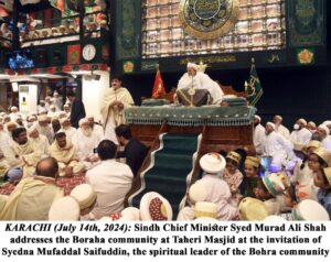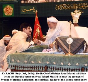 ڪراچي (14 جولاءِ 2024ع) سنڌ جي وڏي وزير سيد مراد علي شاهه بوهرا برادري جي روحاني پيشوا سيدنا مفضل سيف الدين جي ڪراچي دوري تي خوشي جو اظهار ڪندي کيس ايندڙ سال ٻيھر اچڻ جي درخواست ڪئي آهي. هن اها ڳالهه طاهري مسجد ۾ ڪئي، جتي هو بوهرا برادري جي روحاني پيشوا سيدنا مفضل سيف الدين جو خطبو ٻڌڻ لاءِ پهتو هو. وڏي وزير سان گڏ صوبائي وزير، شرجيل انعام ميمڻ، ناصر حسين شاهه، سعيد غني،