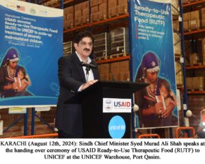 ڪراچي (12 آگسٽ): سنڌ جي وڏي وزير سيد مراد علي شاهه چيو آهي ته سندس حڪومت يونيسيف ۽ يو ايس ايڊ جي اهم سهڪار سان صوبي ۾ غذائي کوٽ ۽ اسٽنٽنگ کي منهن ڏيڻ لاءِ پنهنجي عزم کي ورجايو آهي. هن اها ڳالهه سومر ڏينهن پورٽ قاسم تي يونيسيف جي ويئرهائوس ۾ آمريڪي سفير ڊونلڊ بلوم پاران يونيسيف کي آر يو ٽي ايف حوالي ڪرڻ واري تقريب کي خطاب ڪندي چئي. تقريب ۾ صحت واري صوبائي وزير ڊاڪٽر عذرا فضل پيچوهو، بي ايڇ اي جي ڏکڻ ۽ وچ ايشيا جي ريجنل ڊائريڪٽر مس ايوانا ووڪو، يو ايس قونصل جنرل ڪراچي ڪونارڊ ٽرائبل، يو ايس ايڊ جي مشن ڊائريڪٽر ڪيٽ سوم وانگسري، يونيسيف جو نمائندو عبدالله فادل، سيڪريٽري صحت ريحان بلوچ ۽ ٻين شرڪت ڪئي. وڏي وزير 2022ع جي تباهي واري ٻوڏ سبب درپيش چيلينجز کي منهن ڏيڻ ۾ عالمي ڀائيوارن جي اهم ڪردار کي ساراهيو. مراد علي شاهه چيو ته يونيسيف ادارو بريسٽ فيڊنگ ايڪٽ تي نظرثاني ۽ ان کي اختيار ڪرڻ، انساني ۽ ملٽي سيڪٽرل تعاون کي وڌائڻ ۽ ڏکين علائقن ۾ غذائي سهولتون فراهم ڪرڻ ۾ اهم ڪردار ادا ڪري رهيو آهي. هن چيو ته ٻاهرين ٽيمن ذريعي يونيسيف غذائي کوٽ جي جلد سڃاڻپ ۽ سندس علاج جي سهولت فراهم ڪندي قليل مغذي جو خاتمو آندو آهي. هن وڌيڪ چيو ته يونيسيف پيپلز پرائمري هيلٿ ڪيئر انيشيٽو (پي پي ايڇ آءِ) ۽ ٻين