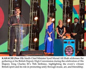 مٽاسٽا سان اسان جي وچ ۾ دوستي ۽ باهمي احترام وڌندو آهي. سنڌ جي وڏي وزير مراد علي شاهه شاه چارلس (ٽيون) کي سندس 76 هين سالگرهه تي سنڌ جي عوام طرفان دل جي گهراين سان واڌايون ڏيندي اميد ظاهر ڪئي ته هو وڌيڪ سال امن، صحت ۽ خوشين سان گذارين ۽ وڏي وزير سنڌ ۽ برطانيه وچ ۾ ويجها ثقافتي لاڳاپا قائم ڪرڻ جي اهميت تي پڻ زور ڏنو. تقريب ۾ ثقافتي مٽاسٽا ۽ ڀائيواري جي جذبي سان گڏ سڀني فڪر جي ماڻهن سان موسيقي، فن ۽ دوستي جو جشن ملهايو ويو. وڏي وزير برطانوي ڊپٽي هاءِ ڪمشنر کي هاءِ ڪميشن پهچڻ تي گلن جو گلدستو پيش ڪيو ۽ ڪنگ چارلس (ٽيون) کي سندس 76 هين سالگرهه جي مبارڪباد ڏني.