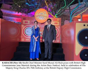 ڪراچي (15 نومبر) سنڌ جي وڏي وزير سید مراد علي شاهه برطانوي ڪنگ چارلس (ٽيون) جي 76هين سالگرهه جي تقريب ۾ برطانوي قونصليٽ جي شرڪت تي خوشي جو اظهار ڪندي تقريب کي فن، موسيقي ۽ دوستي کي هٿي وٺرائڻ جو سبب قرار ڏنو. ڪراچي ۾ برطانوي قونصليٽ پهچڻ تي ڊپٽي هاءِ ڪمشنر وڏي وزير جو شاندار استقبال ڪيو. پنهنجي خطاب ۾ مراد علي شاهه سنڌ جي عظيم ثقافتي ورثي، موسيقي، شاعري ۽ فن سان ان جي لاڳاپن کي اجاڳر ڪيو. وڏي وزير چيو ته سنڌ هزارين سالن کان موسيقي، شاعري ۽ فن تي مشتمل ثقافت جي ڌرتي رهي آهي. سنڌ جي فنڪارن دنيا جي موسيقيءَ تي گهرا تاثر ڇڏيا آهن. وڏي وزير عظيم ثقافتي ورثي جي تحفظ لاءِ عزم جو اظهار ڪندي چيو ته سنڌي ثقافتي ڏهاڙو ۽ ٻين پروگرامن جو مقصد فن ۽ آرٽ جي واڌاري لاءِ ثقافتي ورثي جو تحفظ ڪرڻ آهي. مراد علي شاهه چيو ته برطانيا ۽ سنڌ ٻنهي ۾ هڪ جهڙيون تخليقي روايتون آهن جن عالمي موسيقي ۽ فن تي اثر ڇڏيو آهي. ثقافتي پارٽنرشپ جي اهميت تي ڳالهائيندي مراد علي شاهه چيو ته اهڙن پروگرامن ذريعي زندگي جا نوان خيال پيدا ٿيندا آهن، صلاحيتن ۽ ثقافتن جي