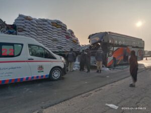 گهارو لڳ فلٽر پلانٽ وٽ ٺٽو ڪراچي قومي شاهراھ تي مسافر ڪوچ جو بيٺل ٽرڪ سان ٽڪر 8 مسافر زخمي، زخمين کي 1122 ريسڪيو ٽيمن ريسڪيو ڪري اسپتالن ۾ منتقل ڪيو زخمين ۾ پروين مظهر عامر حڪيم