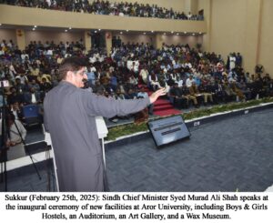 سکر (25 فيبروري): سنڌ جي وڏي وزير سيد مراد علي شاهه جي سکر جي هڪ ڏينهن واري دوري ۾ ڪيتريون ئي اڳڀرائيون ٿيون جن ۾ خاص طور تي تعليم، انفراسٽرڪچر جي ترقي، ڪميونٽي جي حفاظت ۽ زرعي معيشت کي هٿي وٺرائڻ لاءِ آبپاشي نظام کي مضبوط ڪرڻ تي ڌيان ڏنو ويو. دوري ۾ اروڙ يونيورسٽي ۽ آئي بي اي سکر ۾ شاندار افتتاح، وڏن اسڪالر شپ پروگرامن جو اعلان ۽ امن امان جي بهتري لاءِ پختو عزم شامل هئا. اروڙ يونيورسٽي: وڏي وزير اروڙ يونيورسٽي آف آرٽ، آرڪيٽيڪچر، ڊيزائن ۽ هيريٽيج ۾ ڪيترين ئي جديد سهولتن جو افتتاح ڪيو جن ۾ نينگرن ۽ نياڻين جي هاسٽل، هڪ آڊيٽوريم، هڪ متحرڪ آرٽ گيلري ۽ ويڪس ميوزيم شامل آهن. وڏي وزير چيو ته ان قدم سان سکيا وارو ماحول بهتر ٿيندو ۽ شاگردن ۾ تخليقي صلاحيت کي هٿي ملندي. اعليٰ تعليم جي حوالي سان حڪومت جي عزم جو اظهار ڪندي مراد علي شاهه آڪسفورڊ يونيورسٽي ۾ ”ڀٽو اسڪالر شپ پروگرام“ جو اعلان ڪيو. هي پروگرام هر سال سنڌ جي مستحق شاگردن کي ڇهه اسڪالر فراهم ڪندو جن ۾ نوجوانن لاءِ ٽي اسڪالرشپ شهيد ذوالفقار علي ڀٽو جي اعزاز ۾ ۽ ٽي نوجوان عورتن لاءِ شهيد بينظير ڀٽو جي اعزاز ۾ شامل آهن. هن چيو ته هي قدم اعليٰ تعليم جا دروازا کوليندو ۽ صوبي جي نوجوانن کي عالمي سطح تي اڳيان وڌڻ لاءِ همٿائيندو. مدد گهرڻ واري اشاري ڪرڻ تي وڏي وزير اي آءِ جي شاگرد کي نئين ليپ ٽاپ جو اعلان ڪري حيران ڪري وڌو جيڪو هن ذاتي طور تي ڊي سي سکر ذريعي ڏنو آهي. ٽيڪنالاجي ۾ اها سيڙپڪاري شاگردن کي مصنوعي ذهانت جي ميدان ۾ پنهنجي پڙهائي کي اڳتي وڌائڻ جي صلاحيت ڏيندو. آئي بي اي سکر: آئي بي اي سکر کي سنڌ جي تعليم جي شعبي جو ”قيمتي زيور“ قرار ڏيندي وڏي وزير مراد شاهه مستقبل جي اڳواڻن کي نکارڻ ۾ اداري جي ڪردار جي واکاڻ ڪئي. آءِ بي اي سکر ۾ منعقد پاڪستان لٽريچر فيسٽيول (پي ايل ايف) ۾ پنهنجي خطاب دوران هن صوبي جي اعليٰ تعليم ۾ نمايان ترقي کي ساراهيو،