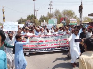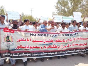 سنڌو درياءُ تي ڪئنالن جي اڏاوت ۽ درياءُ جي پاڻي تي ڌاڙي خلاف مڪلي تي ٺٽي ضلعي جا سوين استاد ڪلرڪ لوئر اسٽاف جا ملازم سياسي سماجي ڪارڪن روڊن تي نڪري آيا ڊي سي چوڪ کان احتجاجي مارچ ڪري نيشنل پريس ڪلب ٺٽو آڏو ڌرڻو ھنيو استادن جي احتجاج ۾ ”وفاق ڪر واضع اعلان ڪئنال کپن يا پاڪستان سنڌو تي ڌاڙو نامنظور درياءُ تي ڌاڙو نامنظور“ جا سخت نعرا ھنيا ويا گسٽا ٺٽي جي ضلعي صدر غلام نبي خشڪ عبدالڪبير خاصخيلي خان محمد هيلايو پ ٽ الف ٺٽي جي ضلعي صدر شريف تنيو غلام مصطفي بروهي آپڪا جي مرڪزي اڳواڻ احمد نواز پٺاڻ لوئر اسٽاف ايسوسيشن جي ضلعي صدر منير بروهي ۽ ٻين جي اڳواڻي ۾ ڊي سي چوڪ مڪلي وٽان احتجاجي مارچ شروع ٿيو ته ان ۾ وڏي انگ ۾ استاد ۽ مختلف سياسي سماجي تنظيمن جا ڪارڪن شامل ٿي ويا احتجاجي مارچ ۽ مظاهرو ” وفاق تو سان جهيڙو آ پاڻي خاطر جهيڙو آ ڪئنال سمورا نامنظور “ جي نعرن سان گونجي اٿيو احتجاجي مارچ ۽ مظاهري ۾ استادن ڪلرڪن لوئر اسٽاف جي ملازمن کان علاوه ڊسٽرڪٽ بار ايسوسيشن ٺٽي جي
