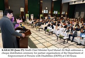 ڪراچي (27 جون): سنڌ جي وڏي وزير سيد مراد علي شاهه معذور ماڻهن (PWDs) لاءِ بااختيار ۽ جامع سماج جي قيام جي حڪومتي عزم کي ورجائيندي 40 ڪروڙ رپين جي مالي امداد جو اعلان ڪيو آهي. وزيراعليٰ هائوس ۾ معذور ماڻهن جي بهبود واري کاتي (DEPD) جي ميزباني هيٺ 40 ڪروڙ رپين جي چيڪ ورهائڻ واري تقريب کي خطاب ڪندي وڏي وزير چيو ته پائيدار شراڪتون، مددگار ٽيڪنالاجين تائين رسائي، جامع تعليم، ۽ برابري جي بنياد تي روزگار جا موقعا صوبائي حڪومت جون اهم ترجيحون آهن. هن موقعي تي صوبائي وزير شرجيل انعام ميمڻ، ناصر حسين شاهه، سعيد غني، رياض شاهه شيرازي، ضياءُ الحسن لنجار، حاجي علي حسن زرداري، شاهيد ٿهيم، محمد علي ملڪاڻي، سينيٽر وقار مهدي، خاص مددگار سيد قاسم نويد ۽ سرفراز راڄڙ، چيف سيڪريٽري آصف حيدر شاهه، سيڪريٽري DEPD طه فاروقي، ٻين سيڪريٽرين ۽ معذور ماڻهن جي حقن تي ڪم ڪندڙ پارٽنر ادارن جي نمائندن به شرڪت ڪئي. وڏي وزير 56 پارٽنر تنظيمون جيڪي 40 ڪروڙ رپين جي امدادي پيڪيج ۾ شامل آهن انهن کي چيڪ ڏنا ۽ ٻڌايو ته اها رقم اڳ ۾ ئي انهن جي اڪائونٽن ۾ منتقل ٿي چڪي آهي. وڏي وزير چيو ته “جهڙوڪ وهيل چيئر، ھٿرادو عضون ۽ رابطي جا اوزار رڳو اوزار نه پر آزادي، عزت ۽ موقعن جي علامت آهن.” هن وڌيڪ چيو “اسان اهڙو سماج ٺاهي رهيا آهيون جتي ڪوبه پٺتي نه رهي.” ان موقعي تي خاص ٻارن پاران ٽيبلو پيش ڪيا ويا جن مان هڪ پاڪستان جي هٿياربند فوج کي ڀيٽا ڏيڻ وارو ٽيبلو پڻ شامل هو. انهن ٻارن جي ٺاهيل آرٽ ورڪ جنهن ۾ شهيد محترمه بينظير ڀٽو ۽ وڏي وزير جون تصويرون شامل هيون، اسٽيج تي لڳايون ويون ۽ پوءِ وڏي وزير کي تحفي طور پيش ڪيون ويون. مراد علي شاهه وڌيڪ ڪيترن ئي قدمن ۽ منصوبن جو اعلان ڪيو جن ۾ بجٽ ۾ اضافو پڻ شامل آهي. وڏي وزير چيو ته “DEPD جو ايندڙ مالي سال جو بجٽ 80 ڪروڙ رپيا مقرر ڪيو ويو آهي.” هن ٻڌايو ته غيرسرڪاري ادارن سان گڏجي 20 نوان مرڪز قائم ڪيا ويا آهن جڏهن ته 15 اڳ موجود مرڪزن جي گنجائش وڌائي وئي آهي ۽ 66 مرڪزن ۾ پڪ اينڊ ڊراپ سهولت لاءِ ٽرانسپورٽ سپورٽ ۾ به اضافو ڪيو ويو آهي. هن چيو ته 12 آٽزم سينٽر هن سال جي آخر تائين ڪم شروع ڪري ڇڏيندا جڏهن ته هر ضلعي ۾ گهٽ ۾ گهٽ هڪ مرڪز قائم ڪرڻ جو ارادو آهي. سي آرٽس بابت وڏي وزير ٻڌايو ته لاڙڪاڻي ۾ CRTS سينٽر هن سال شروع ڪيو ويندو جڏهن ته شهيد بينظير آباد سينٽر ۾ 25 ٻارن جو داخلا ٿي چڪو آهي، ۽ صدر آصف زرداري جي هدايت تي ميرپورخاص ۾ به هڪ نئون سينٽر قائم ڪيو ويندو. جامع تعليم بابت وڏي وزير چيو ته خاص ٻارن کي مين اسٽريم اسڪولن ۾ داخل ڪرائڻ لاءِ هڪ الڳ ڊائريڪٽوريٽ قائم ڪئي وئي آهي ۽ ان لاءِ خاص نصاب به تيار ڪيو ويو آهي. وڏي وزير ٻڌايو ته هي تقريب شهيد محترمه بينظير ڀٽو جي نالي ڪئي وئي آهي جن “جمهوريت جي حفاظت لاءِ پنهنجي جان قربان ڪئي”. ھن هدايت ڪئي ته سڀني سرڪاري عمارتن ۾ وهيل چيئر ريمپ لازمي ٺاهيا وڃن ۽ ٻڌايو ته وزيراعليٰ هائوس هاڻي مڪمل طور تي وهيل چيئر دوست بڻايو ويو آهي. مراد علي شاهه چيو ته جيتوڻيڪ گهڻو ڪجهه ٿي چڪو آهي پر اڃا به گهڻو ڪجهه ڪرڻو آهي. هن پارٽنر ادارن جي ڪردار جي واکاڻ ڪندي چيو ته انهن جي گڏيل تعاون سان ئي ڊگهي عرصي واري تبديلي ممڪن آهي. آخر ۾ وڏي وزير چيو “شموليت، رسائي ۽ عزت ڪا مراعات نه پر حق آهن ۽ اسان پنهنجي پارٽنرن سان گڏجي وڌيڪ همدرد ۽ بهتر سماج ٺاهينداسين.”