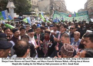 ڪراچي (6 سيپٽمبر): عيد ميلادالنبي ﷺ جي بابرڪت ڏينهن جي موقعي تي سنڌ جي وڏي وزير سيد مراد علي شاهه پنهنجي ڪابينا جي ميمبرن سان گڏ ميمڻ مسجد، بولٽن مارڪيٽ ۽ ملير جي جلوسن جي اڳواڻي ڪئي۔ ميمن مسجد: وڏي وزير سنڌ سيد مراد علي شاهه صوبائي وزير شرجيل انعام ميمن ۽ سعيد غني، گهرو وزير ضياءُ الحسن لنجار، ميئر ڪراچي مرتضيٰ وهاب ۽ ٻين اهم شخصيتن سان گڏ ميمڻ مسجد جو دورو ڪيو جتي هن امتِ مسلمه کي هن مقدس ڏينهن جي موقعي تي مبارڪباد ڏني۔ وڏي وزير پيغمبر اسلامﷺ جي امن، ڀائيچاري ۽ هم آهنگي جي پيغام تي روشني وڌي ۽ پاڻ ﷺ ۽ اوهان جي اهلِ بيت کي خراجِ عقيدت پيش ڪيو۔ هن شهريَن کي چيو ته حضورﷺ جي تعليمات تي عمل ڪرڻ ئي دنيا ۽ آخرت ۾ ڪاميابي جي ضمانت آهي۔ ملير: ان کان اڳ وڏي وزير سنڌ سيد مراد علي شاهه، دارالعلوم مجدديه ملير جي اهتمام هيٺ ڪڍيل شاندار جلوس ۾ صوبائي وزير سعيد غني ۽ ميئر ڪراچي مرتضيٰ وهاب سان گڏ شرڪت ڪئي۔ تقريب جي اڳواڻي مفتي محمد جان نعيمي ڪئي جنهن ۾ عاشقن وڏي انگ ۾ شرڪت ڪئي۔ ميڊيا سان ڳالهائيندي وڏي وزير سنڌ چيو ته سڄي دنيا جي مسلمانن سميت سنڌ ۾ به حضورﷺ جي يوم ولادت وڏي عقيدت ۽ احترام سان ملهايو پيو وڃي۔ هن حضورﷺ جي زندگي کي انسانيت لاءِ بهترين نمونو ۽ مشعلِ راهه قرار ڏنو۔ وڏي وزير دعا گهري ته الله پاڪ اسان کي حضورﷺ جي تعليمات تي هلڻ جي توفيق عطا فرمائي۔ هن وڌيڪ چيو ته “مخلوق جي خدمت، خالق جي خدمت آهي” ۽ زندگي کي حضورﷺ جي ٻڌايل اصولن مطابق گذارڻ ئي ڪاميابي آهي۔ وڏي وزير دنيا جي مسلمانن کي عيد ميلادالنبيﷺ جي مبارڪباد ڏني ۽ پاڪستان جي سلامتي، امن ۽ ترقي لاءِ خاص دعا ڪئي۔ وزيراعليٰ هائوس هن بابرڪت ڏينهن تي سائو ۽ اڇو رنگين روشنيءَ سان روشن ڪيو ويو جيڪو حضورﷺ سان محبت ۽ عقيدت جو اظهار هو۔ سيد مراد علي شاهه هڪ دلي پيغام ۾ چيو ته پيغمبر اسلامﷺ جي آمد انسانيت لاءِ سڀ کان وڏي رحمت آهي۔ هن زور ڏنو ته هر ماڻهو پنهنجي زندگي کي حضورﷺ جي سِيرت مطابق بڻائي جيڪا مساوات، ڀائيچاري ۽ انسانيت جي خدمت جو درس ڏئي ٿي۔ وڏي وزير ماڻهن کي اپيل ڪئي ته ضرورت مند جي خدمت ڪن ڇوته اهڙا عمل عبادت جي هڪ صورت آهن۔ وڏي وزير تباهه ڪن ٻوڏ سبب متاثر ٿيل ماڻهن جي مدد کي قومي ۽ اجتماعي ذميواري قرار ڏنو۔ هن تباهيءَ کان ڇوٽڪاري لاءِ دعا ڪئي ۽ ٻوڏ متاثرن جي خدمت ۽ بحالي لاءِ سنڌ حڪومت جي پُختي عزم جو اظهار ڪيو۔ يومِ دفاع تي خراجِ تحسين: وڏي وزير ملڪ جي ھٿياربندفوج کي يوم دفاع پاڪستان جي موقعي تي زبردست خراج تحسين پيش ڪيو۔ هن 1965ع جي جنگ ۾ ڏنل قربانين، اتحاد ۽ حوصلي کي ياد ڪندي چيو ته پاڪستان جي فوجي طاقت ناقابلِ تسخير آهي۔ مراد علي شاهه چيو ته فوج جي بهادري ۽ جُرئت تي سنڌ کي فخر آهي ۽ ملڪ جي دفاع لاءِ سنڌ جو عزم غيرمتزلزل آهي۔ هن چيو ته شهيدن جون قربانيون هميشه ياد رکبيون ۽ پاڪستان جي ترقي، امن ۽ خوشحالي لاءِ قومي اتحاد ضروري آهي۔ عيد ميلادالنبي ﷺ ۽ يوم دفاع جي ٻنهي خوشين موقعي تي وڏي وزير سنڌ ۽ پاڪستان ۾ اتحاد، خدمت ۽ برداشت جي جذبي کي اجاگر ڪيو جنهن قومي فخر، همدردي ۽ اميد جي پيغام کي وڌيڪ مضبوط ڪيو۔