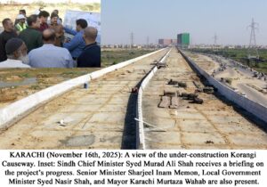 ڪراچي (16 نومبر): سنڌ جي وڏي وزيرسيد مراد علي شاهه ڪورنگي ڪاز وي، شاھراهه ڀٽو ۽ ڪريم آباد انڊر پاس سميت ٽن اهم منصوبن جي بنيادي ڍانجن جي ڪم جو تفصيلي جائزو وٺندي، ڪم جي بهترمعيار۽ تيزيءَ ۾ واڌ لاءِ واضح حڪم جاري ڪيا. وڏي وزير سان گڏ صوبائي وزير شرجيل انعام ميمڻ، سيد ناصر شاهه ۽ ميئر ڪراچي مرتضيٰ وهاب پڻ موجود هئا۔ وڏي وزير چيو ته اسان جو مڪمل ڌيان عوامي مسئلن جو فوري حل فراهم ڪرڻ ۽ سڀني رڪاوٽن کي هٽائڻ تي آهي ته جيئن عوام کي بغيرڪنهن دير جي اچ وڃ جون سهولتون فراهم ڪيون وڃن.