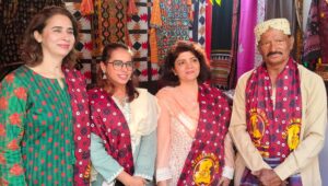 سنڌ جون قابل فخر سورميون محترمه وحيده مھيسر صاحبه , ايڊوڪيٽ شازيا نظاماڻي ۽ ايڊوڪيٽ ماروي ڪلھوڙو کي مھراڻ ھينڊي ڪرافٽس جي اسٽال اچڻ تي خوش آمديد چيو ۽ مھراڻ ھينڊي ڪرافٽس طرفان تيار ڪيل سنڌ لٽريچر فيسٽول جي لوگو وارو اجرڪ اوڍايو ۽ ڪار آمد ڪچھري ٿي ۽ ٽنھي مھمانن ثقافتي شيون پسند ڪيون ۽ خريداري پڻ ڪيي
