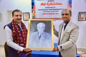 انسٽيٽيوٽ آف آرٽ اينڊ ڊزائن جو انچارج ڊائريڪٽر سعيد احمد منگي وائيس چانسيلر پروفيسر ڊاڪٽر فتح مري کي مادرعلمي جي باني وي سي علامه آءِ آءِ قاضي جو پورٽريٽ تحفي ۾ ڏيندي