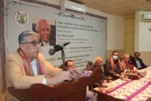 ڄامشورو (پ ر) سنڌ يونيورسٽي ڄامشورو جي ڊپارٽمينٽ آف ھسٽري پاران انسٽيٽيوٽ آف سنڌالاجي جي سهڪار سان سنڌالاجي جي پير حسام الدين راشدي آڊيٽوريم ۾ “ننڍي کنڊ جي سياسي تاريخ ۾ ﷲ بخش سومرو ۽ ٻين سياسي شخصيتن جو ڪردار” جي سري ھيٺ ھڪ ليڪچر پروگرام منعقد ٿيو، جنھن جي صدارت سنڌ يونيورسٽيءَ جي وائيس چانسلر پروفيسر ڊاڪٽر فتح محمد مري ڪئي، جڏهن ته ليڪچر ڏيندڙ ناميارو تاريخدان ڊاڪٽر اشتياق احمد هو. ان موقعي تي قانون جو اڳوڻو وزير محمد عمر سومرو، هسٽري شعبي جو چيئرمين ڊاڪٽر عرفان احمد شيخ، سنڌالاجي جو ڊائريڪٽر ڊاڪٽر فياض لطيف ۽ سنڌ يونيورسٽي هسٽري سوسائٽي جو انچارج ڊاڪٽر بشير جتوئي اسٽيج تي موجود رھيا. پنهنجي آجيان واري تقرير ۾ تاريخ شعبي جي چيئرمين ڊاڪٽر عرفان احمد شيخ سمورن
